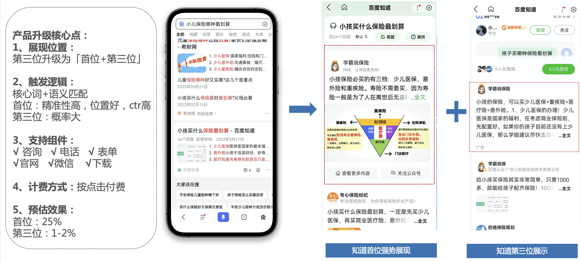 1、分发位置升级:通过与优质官方问答内容整合内容质量更优,展现位置从问答第三位升级为“问答首位+问答第三位”。