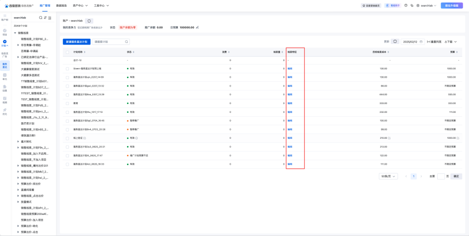 【信息流服务直达计划】的物料列表,点击【线索特征】中的【编辑】,可以对线索特征的时段进行编辑。