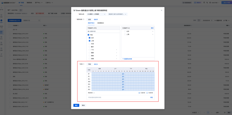 1.升级信息流服务直达计划的能力,增加线索时段设置。即在您未选时段内所收集的线索,即使与您服务匹配、符合您的成本要求,系统也不会为您竞价购买。