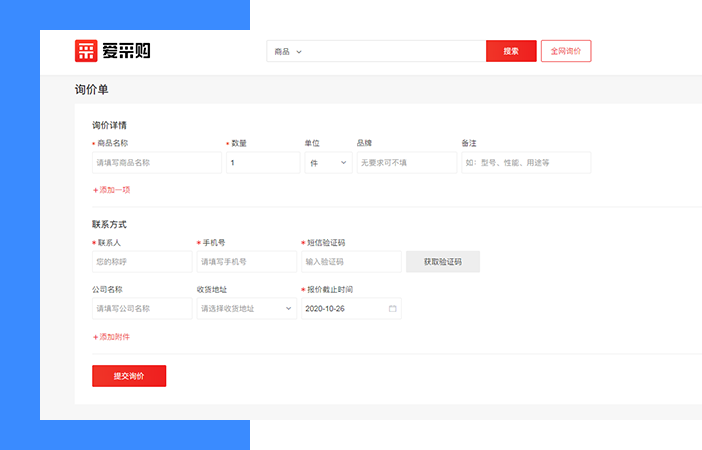 爱采购平台有4处【全网询价】按钮,点击其中任意一个都可进入询价单填写页面;完成采购信息填写并通过审核后,即可在【我的询价单】中查看相关厂商的报价。